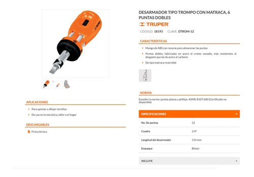 DESARMADOR TIPO TROMPO CON MATRACA, 6 PUNTAS DOBLES INCLUYE 2 Puntas planas 3/16" y 1/4" 4 Puntas phillips PH0 a PH3 6 Puntas torx T10 a T40 CÓDIGO:18193 CLAVE:DTROM-12 CARACTERÍSTICAS Mango de ABS con ranuras para almacenar las puntas Puntas dobles, fabricadas en acero al cromo vanadio, más resistentes al desgaste que las de acero al carbono De tipo matraca reversibleNORMA: Exceden la norma: puntas planas y phillips: